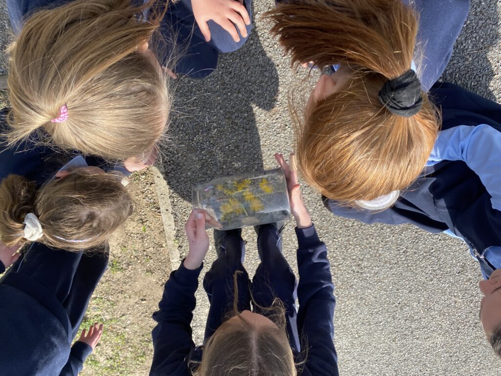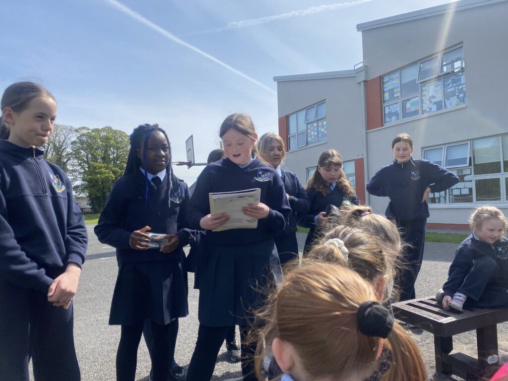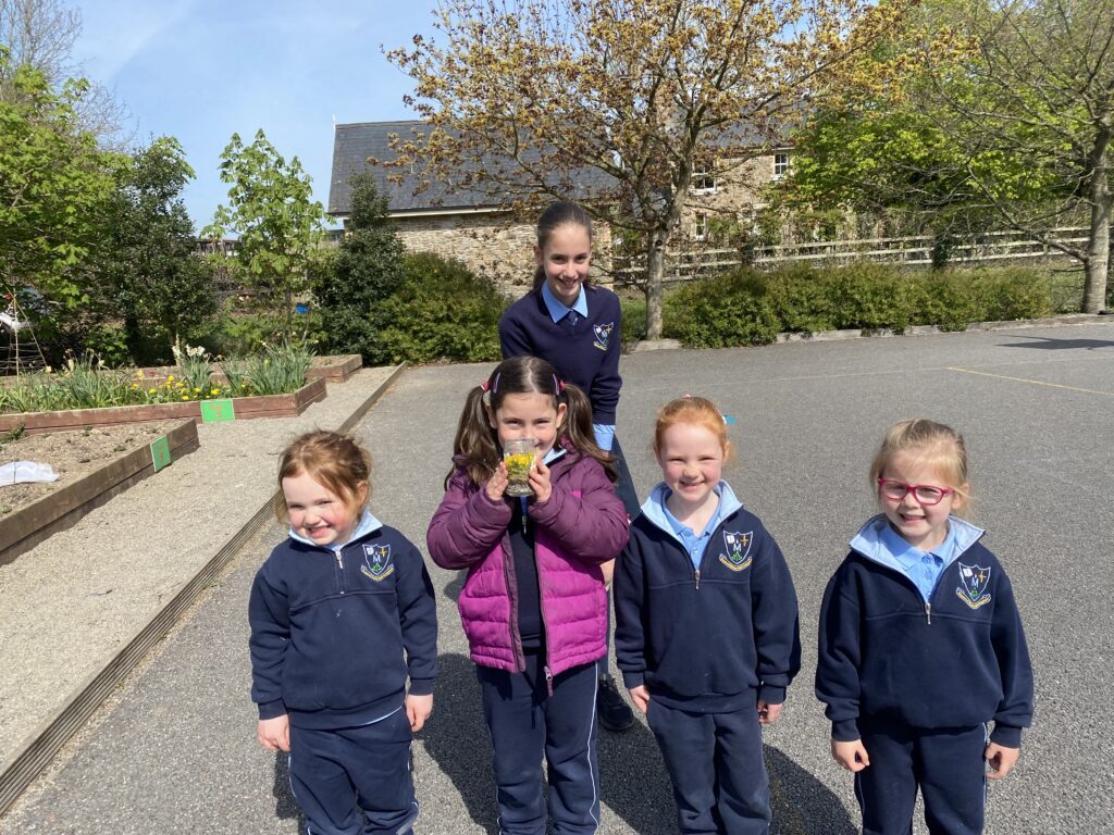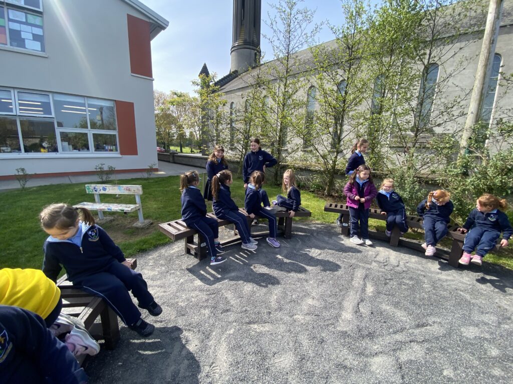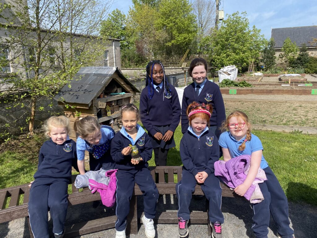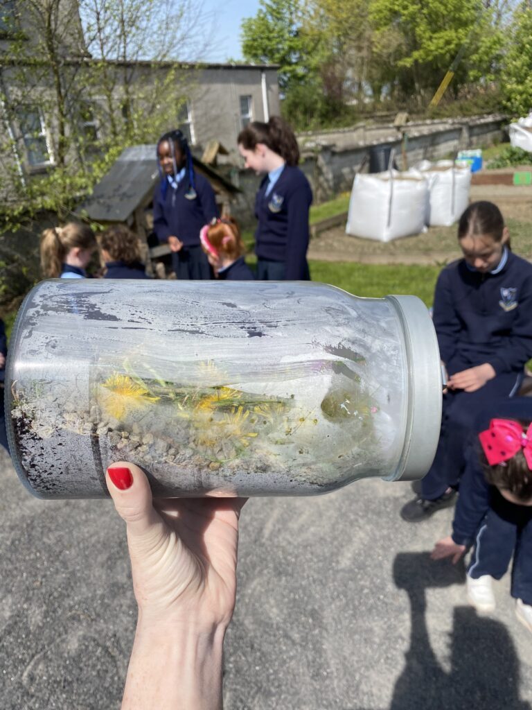The girls of Fifth Class visited Junior Infants at the outdoor classroom. They explained to junior infants that growing a garden-in-a-jar is easy because the garden is self-watering. It works in much the same way as the water cycle- the same water is used over and over again. They created gardens in glass jars. They put pepples, damp compost and small healthy plants into the jars. The jars are airtight and placed in a bright place in the infant classroom. We are looking forward to analysing our gardens over the next two weeks.