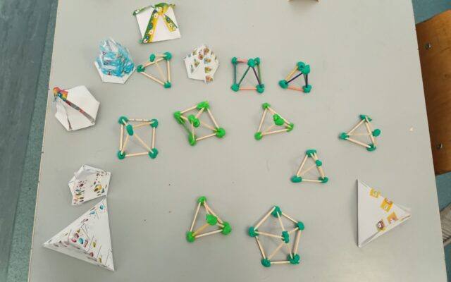 We have been learning about pyramids and prisms. We constructed our own using paper ans matchsticks. Have a look below.